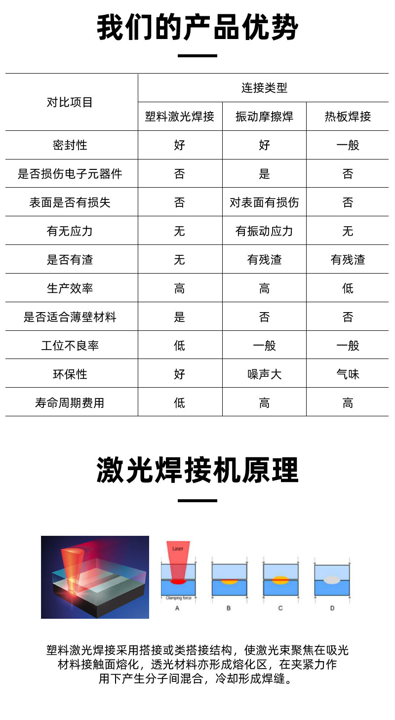 塑料作為一種常規(guī)的工業(yè)材料,廣泛應(yīng)用于工業(yè)品制造的各個(gè)領(lǐng)域,汽車(chē),生活品,電子零部件,醫(yī)療,航空航天,甚至軍用等,塑料的材料類(lèi)型也隨著工業(yè)應(yīng)用的不斷提高,在不斷的更新。對(duì)于塑料的粘合工藝來(lái)講,長(zhǎng)時(shí)間來(lái)集中在涂膠,熱壓焊接,超聲波焊接,高頻紅外等很多成熟的工藝方式,但是隨著塑料產(chǎn)品工藝要求的提高,傳統(tǒng)的塑料加工方式已經(jīng)出現(xiàn)明顯的不足。激光焊接在最近的工業(yè)制造應(yīng)用上有明顯的優(yōu)勢(shì)。當(dāng)然,激光技術(shù)的不斷提升,設(shè)備成本的不斷降低也是促使該行業(yè)進(jìn)入大批量普及應(yīng)用的階段。由原來(lái)的通用型機(jī)器去適配材料,進(jìn)入到可以根據(jù)產(chǎn)品反向定制設(shè)備的階段。在目前來(lái)看,相對(duì)傳統(tǒng)工藝,激光焊接雖然優(yōu)勢(shì)明顯,但是激光焊接并不是取代,而是對(duì)傳統(tǒng)工藝的補(bǔ)充。激光設(shè)備的造價(jià)目前來(lái)講還處在比較高的領(lǐng)域,所以一般情況下,工藝要求高(傳統(tǒng)工藝無(wú)法完成)的加工應(yīng)用,才會(huì)使用激光方式進(jìn)行加工。下表是與常規(guī)傳統(tǒng)工藝簡(jiǎn)易的對(duì)比資料: